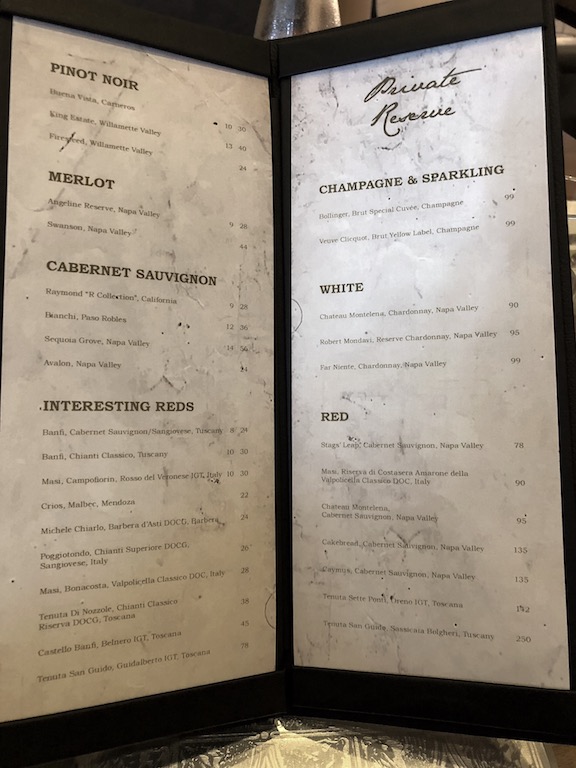 A perfect ending to a perfect meal was the tiramisu — espresso-bathed ladyfingers accompanied with a creamy rich decadent mascarpone mousse dusted with cocoa. Simple and delicious. The plate was not accompanied with the berries or the cookie as described in the menu. The chef let us know the plating would be different than what was in the menu. The rich strong taste of the espresso counterbalances the sweetness from the ladyfingers and creaminess from the mascarpone mousse. The mousse was white and fluffy and seemed to be made without egg yolks like the traditional tiramisu. It seemed like it was made simply with whipped cream and mascarpone.