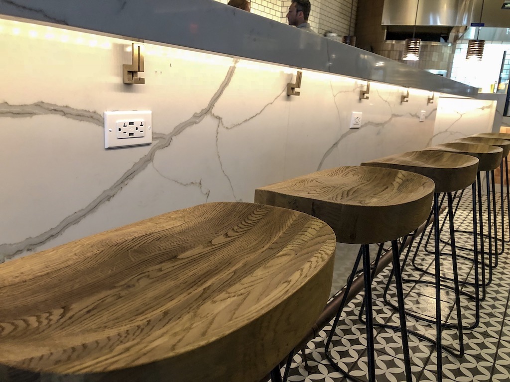 As soon as guests walk in they will feel like they walked into a modern-style kitchen, with attributes that pay homage to Italian culture and cooking items that you would find in your Italian grandmother’s house, or what Italians would call “la casa di nonna.” Whisk chandeliers, steam basket lamps, and even the beautiful Tuscan pottery are what makes this place interesting to even want to walk in. The bar seating is a great place for digital lovers to plug in, grab a drink, have dinner, and get back out to the park. Under the bar top guests can find a place to hang their bags and outlets with USB ports to recharge their electronics while they enjoy their meal. This really stood out for me, being a purse carrier — it is at times bothersome to find a place to put your bags without worrying if it is going to be stolen.